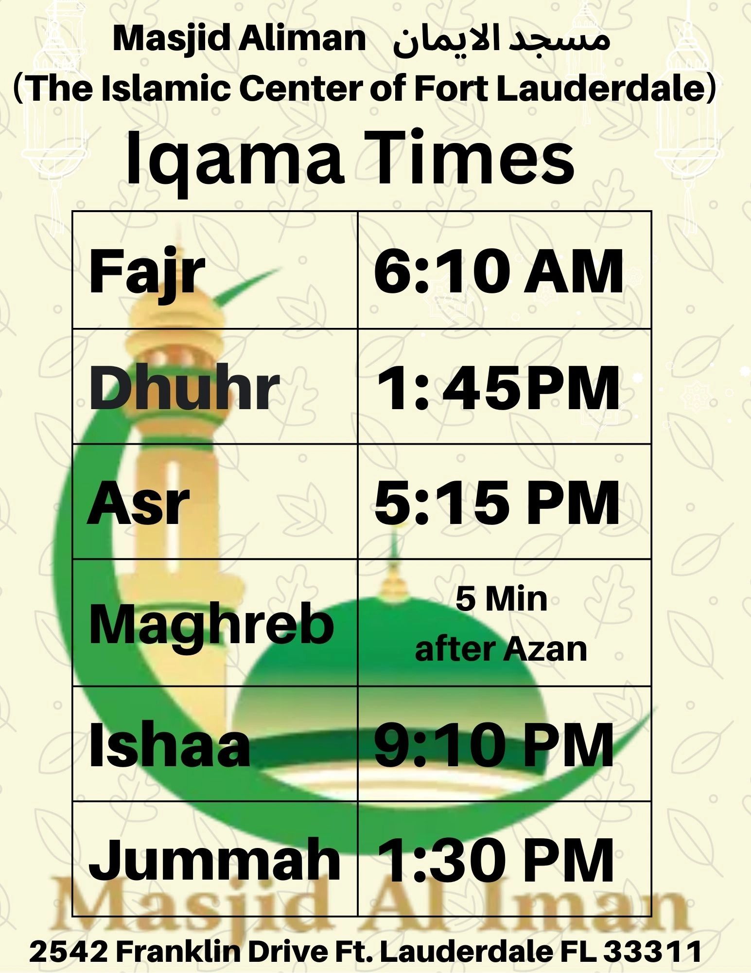 We are delighted to welcome you to Masjid Al Iman of Fort Lauderdale, FL Mosque, a vibrant community where people come together to worship, learn and socialize. Our mission is to promote the teachings of Islam and provide a welcoming, inclusive environment for all. Whether you are a regular worshipper or a first-time visitor, we invite you to explore our website and learn more about what we have to offer.